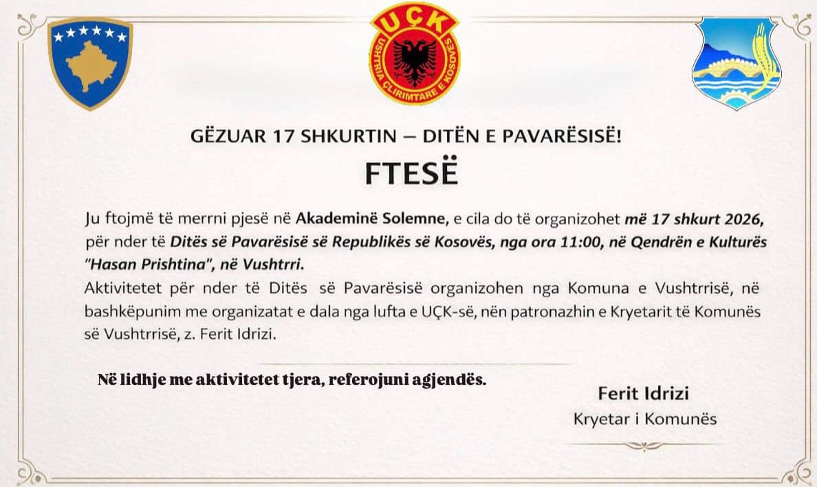 Komuna e Vushtrrisë fton të gjithë qytetarët që të bëhen pjesë e aktiviteteve festive për shënimin e 18-vjetorit të Pavarësisë së Republikës së Kosovës.