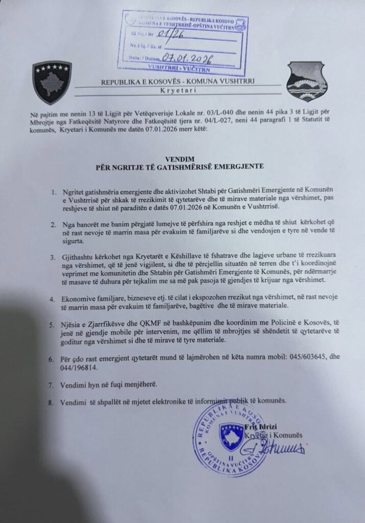 Me këtë vendim është aktivizuar Shtabi për Gatishmëri Emergjente, ndërsa të gjitha strukturat relevante komunale janë në terren dhe në gjendje të plotë gatishmërie për reagim të menjëhershëm.